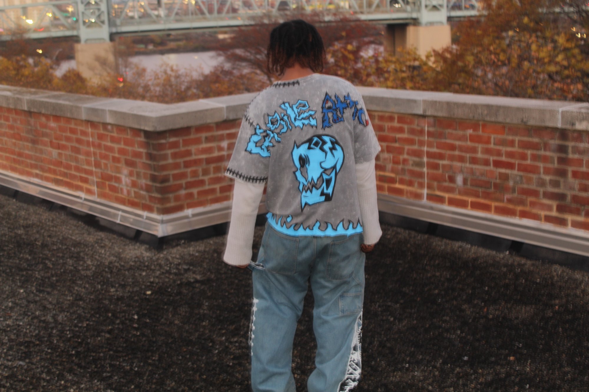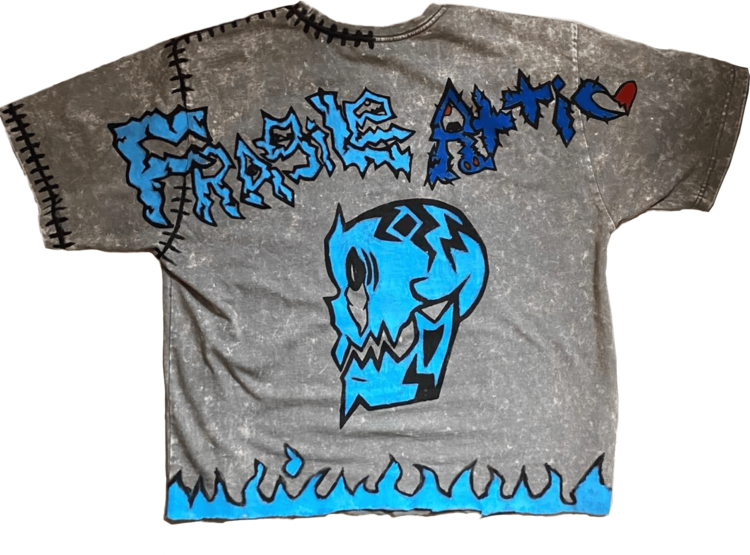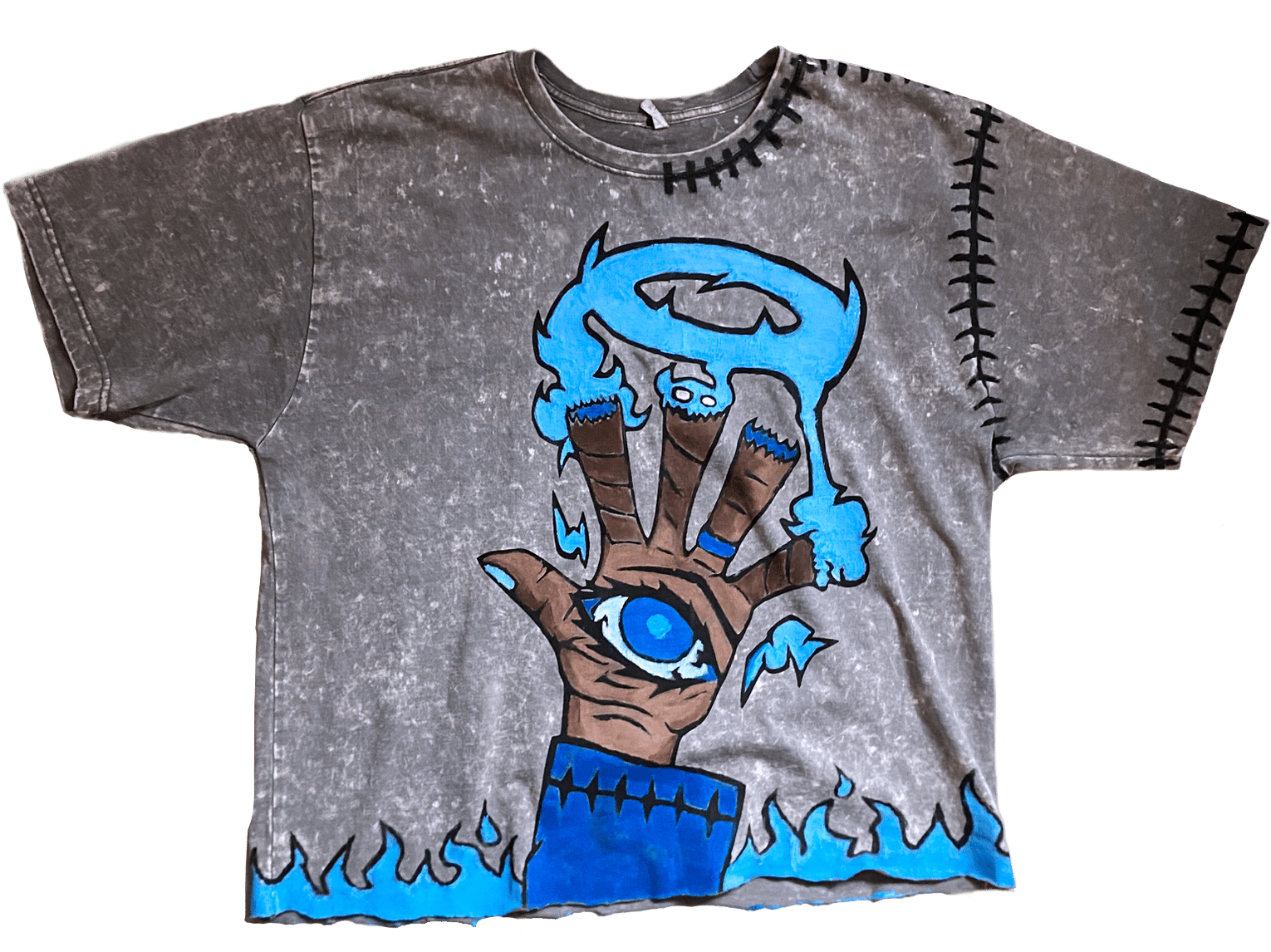 The "Faded Halo" tee features a two sided screen print and hand painted design. Printed on a heavy weighted T- Shirt. The blue demon is one part of the "Faded Angels" team, serving as the closest thing to human within them.