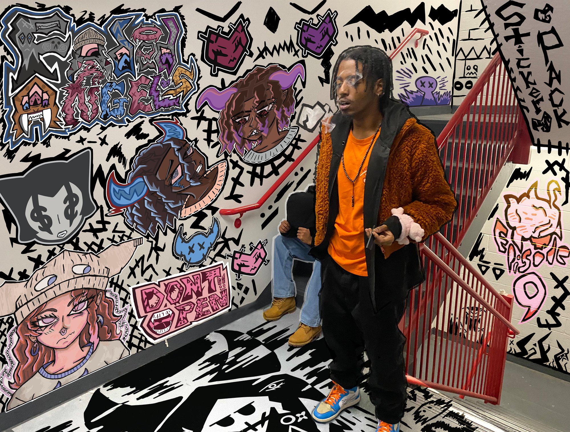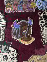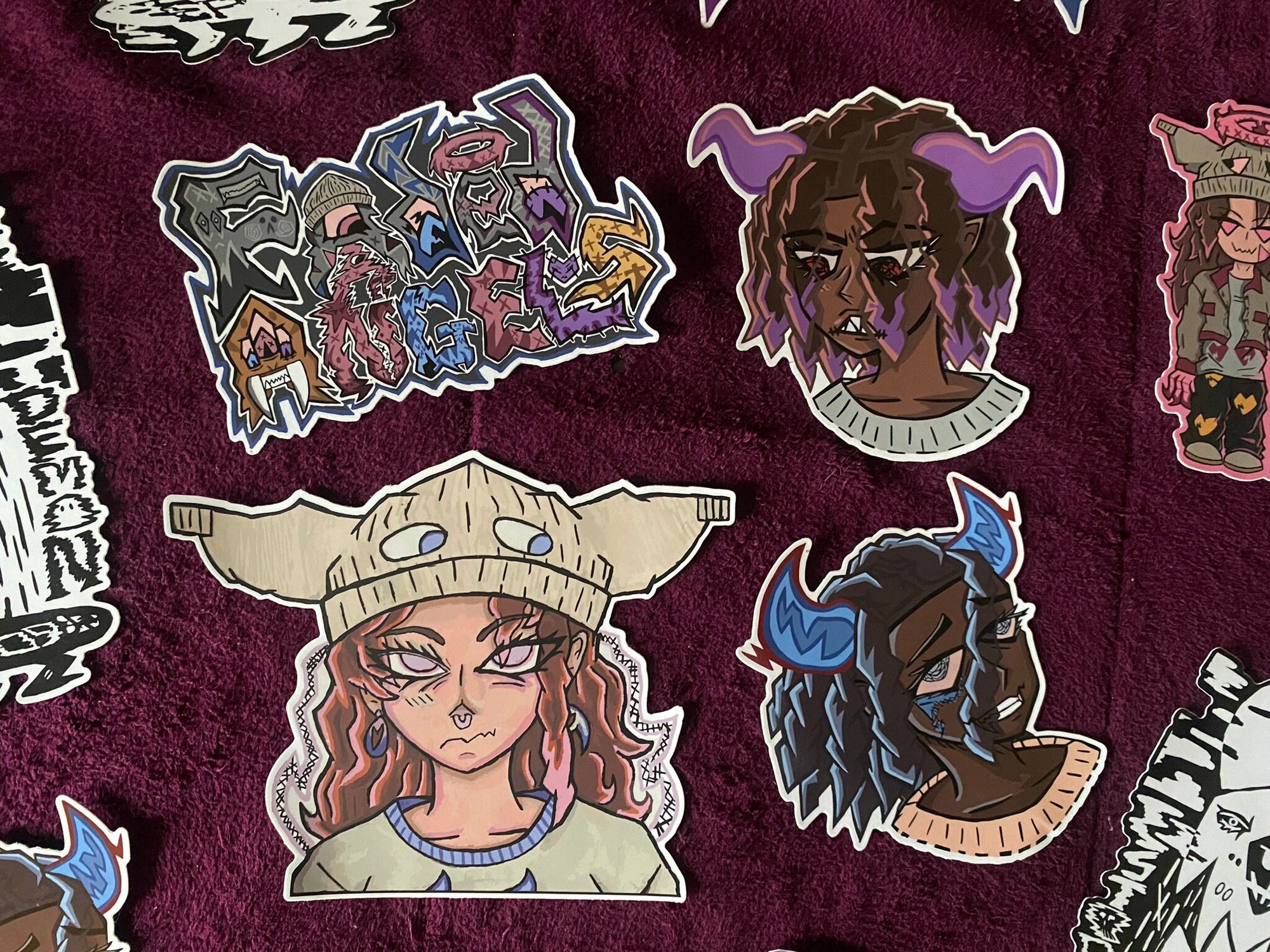 The "Teeve blue Demon" sticker is a 5in 4.9in Vinyl Sticker. After spending years in the "demon" world of his own shadow, Teivi comes across the first human lookin figure he's seen in forever. This person, unnamed at the time, claimed to have a method to return to the real world, the only cost being the loss of part of his soul, where the humanoid "demon" would lay dormant any escape with him. Part of the "FADED ANGELS Sticker Pack"