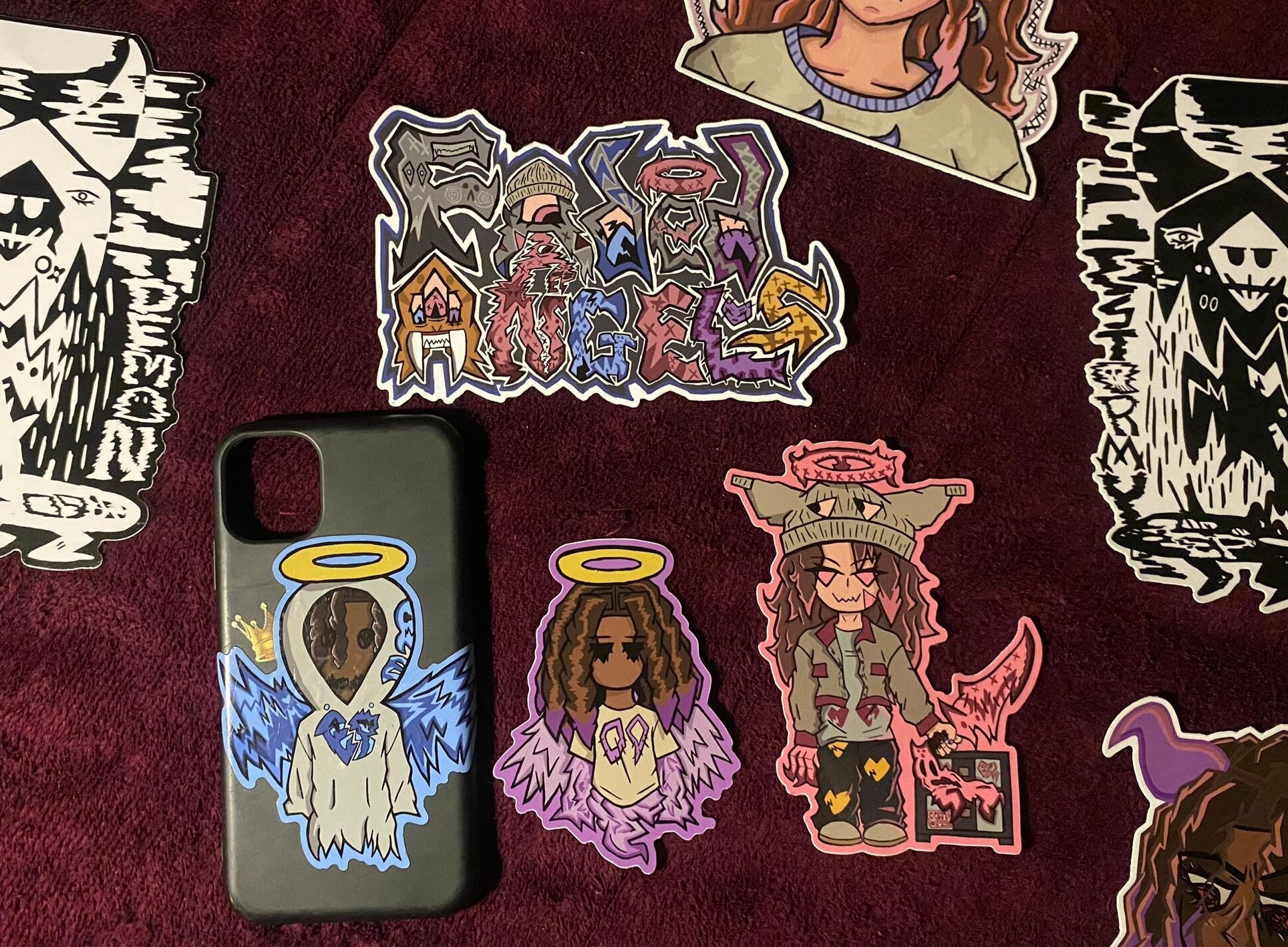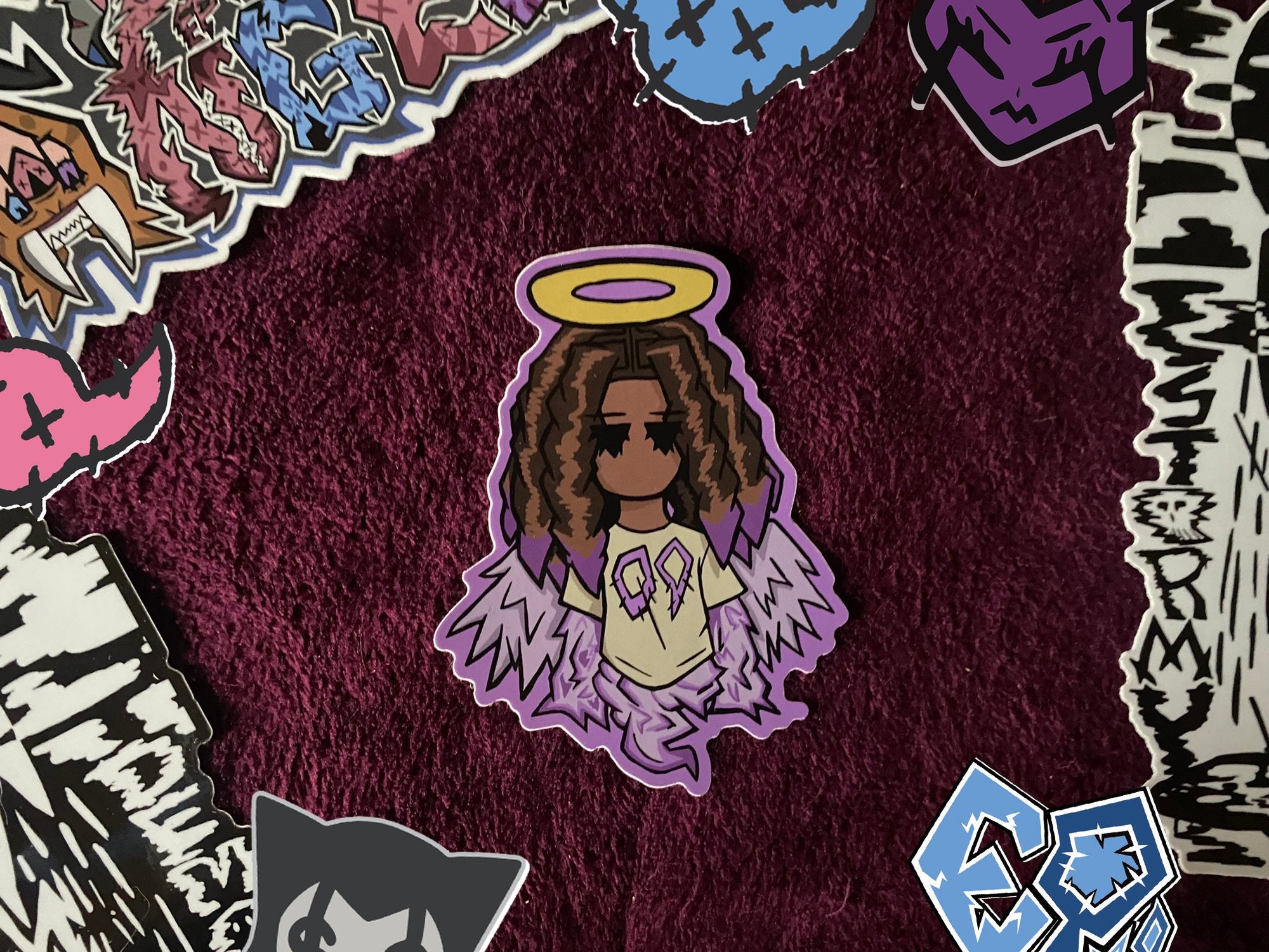 The "Veitea Purple demon" sticker is a 4in x 2.9in Vinyl Sticker. Veitea the "Demon" made a contract with Teeve which allowed him to return to the real world, in exchange for control of part of his soul. The angel form is caused by the events with the Soul Collector. Part of the "FADED ANGELS" Sticker Pack.